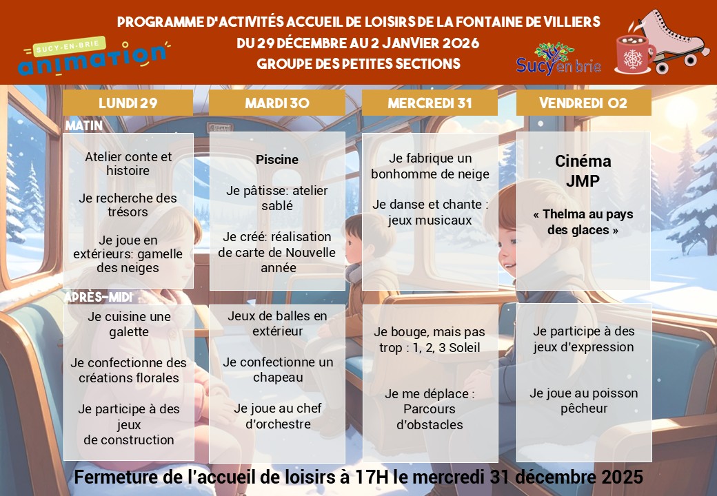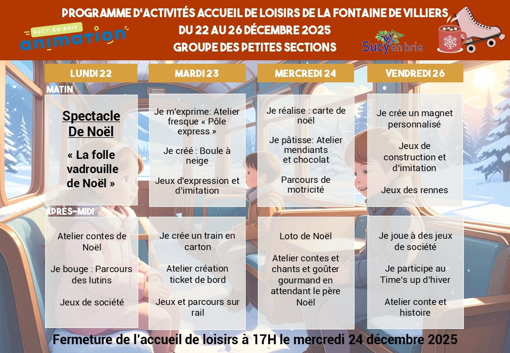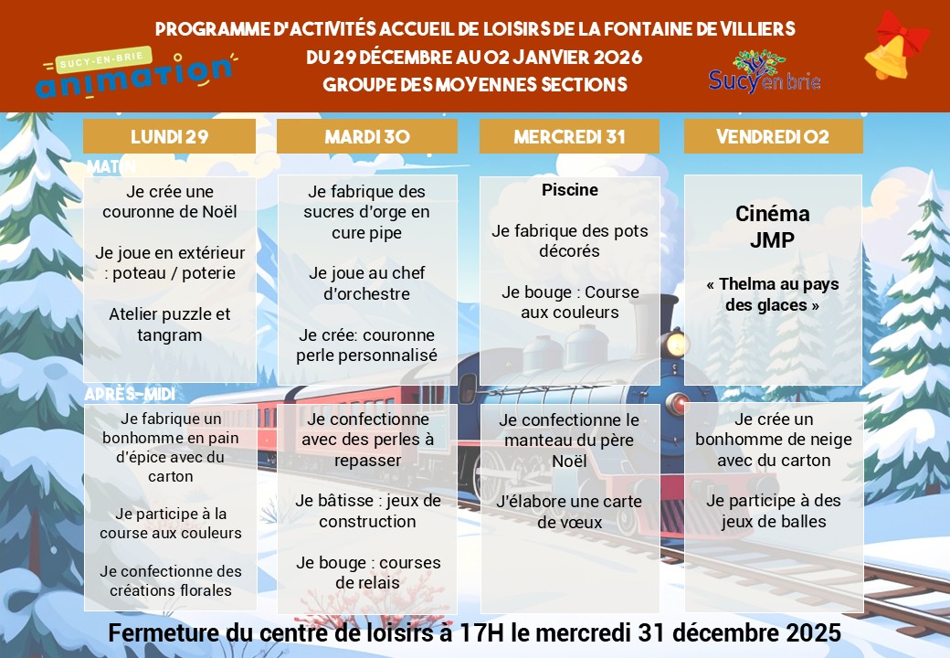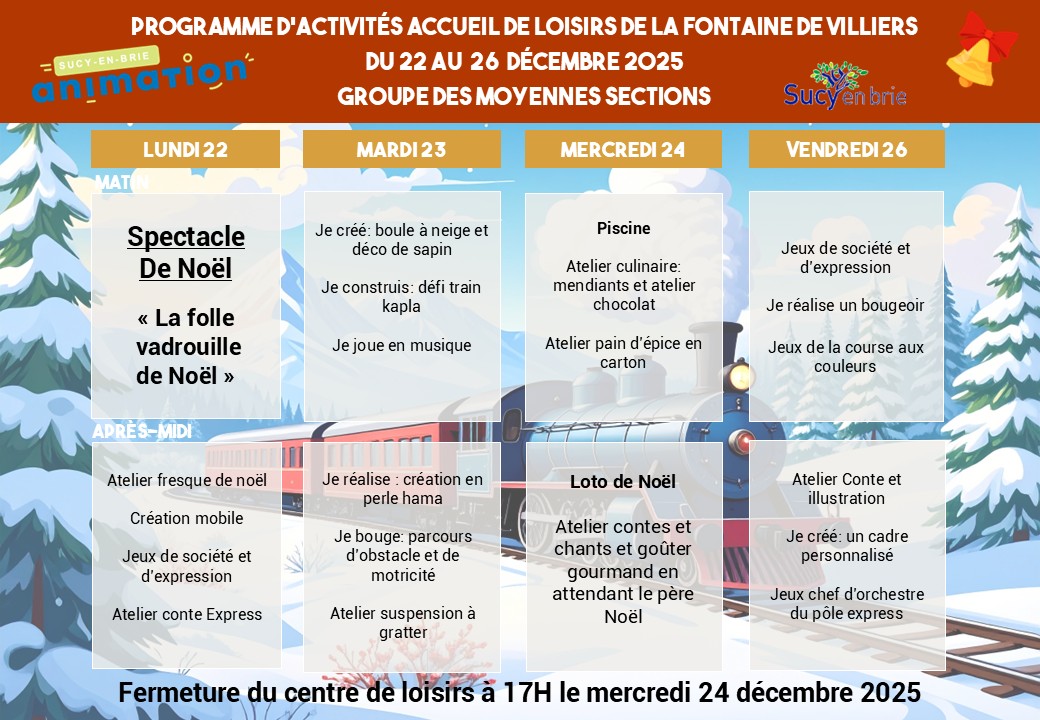 Accueil > Actualités > Vacances de fin d’année (Fontaine De Villiers) Vacances de fin d’année (Fontaine De Villiers) Planning Du 22 décembre 2025 au 02 janvier 2026 . Plongez dans l’univers de « Sucy Express » ! Téléchargez nos programmes Moyennes sections semaine 1 Moyennes sections semaine 2 Petites sections semaine 1 Petites sections semaine 2