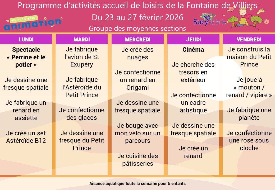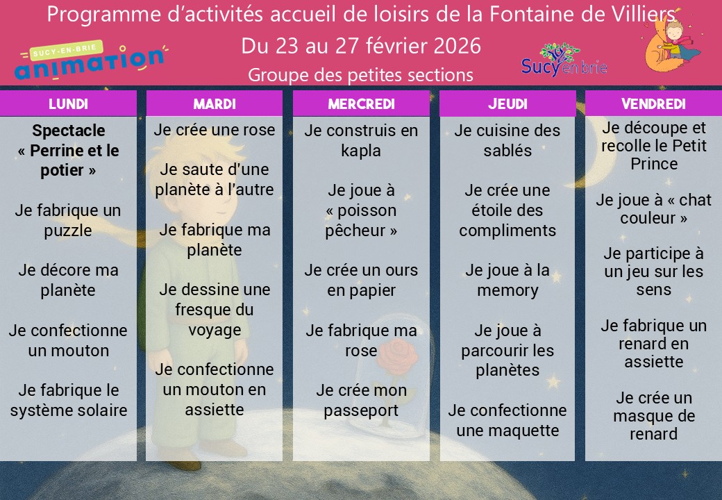 Accueil > Actualités > Vacances d’Hiver (Fontaine De Villiers) Vacances d’Hiver (Fontaine De Villiers) Planning Du 23 février au 06 mars 2026. Plongez dans l’univers du Petit Prince ! Téléchargez nos programmes Petites sections semaine 1 petites sections semaine 2 Moyennes sections semaine 1 Moyennes sections semaine 2